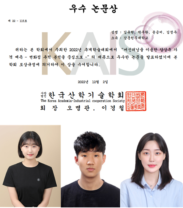한국산학기술학회 우수논문상 수상(김유현, 박주환, 윤금비)강릉원주대학교 경제학과에 재학 중인 김유현, 박주환, 윤금비 학부생은 지난 12월 2~3일 한화리조트(대천)에서 개최된 2022년 한국산학기술학회 추계학술대회에서 우수논문상을 수상2023.01.30